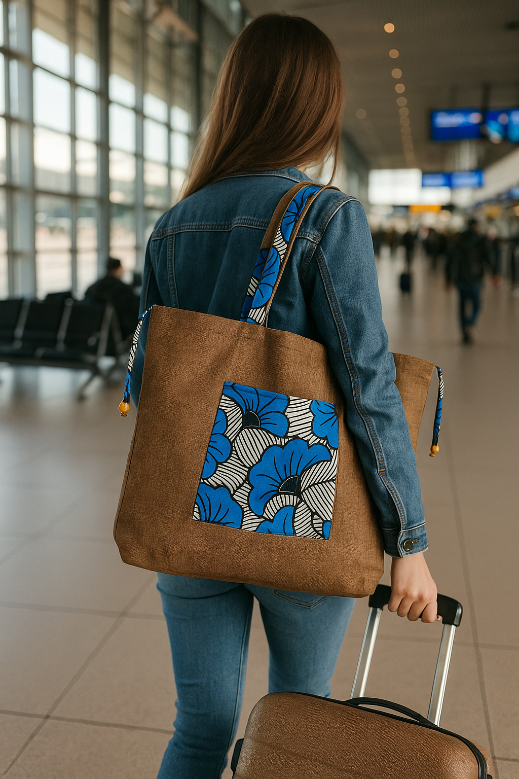 Le sac réversible Bleu Océan s’inspire de la Petite Côté et de la fraîcheur marine. Sa toile marron naturelle associée à des fleurs bleues éclatantes en wax en fait un accessoire raffiné et pratique.