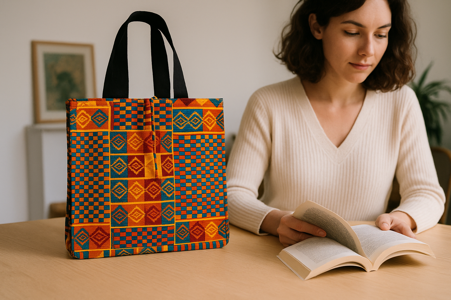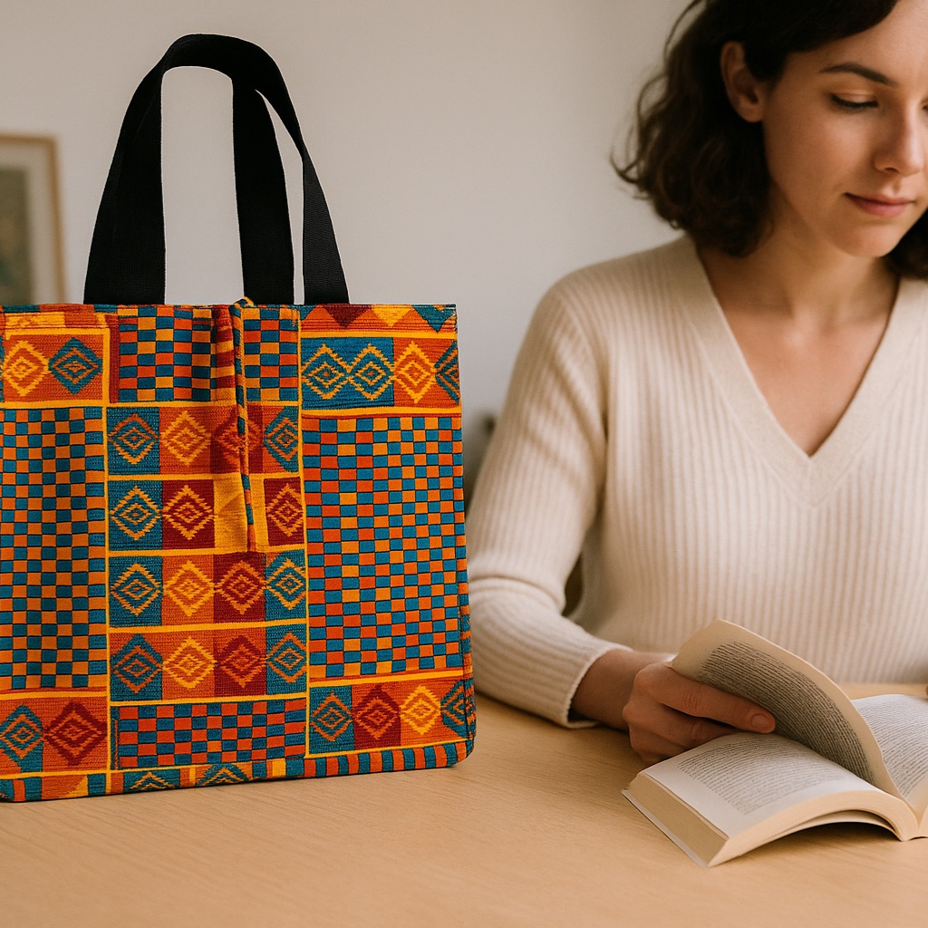 Sac cabas aux tons chauds et lumineux, symbole de richesse, de rayonnement et d’énergie positive.