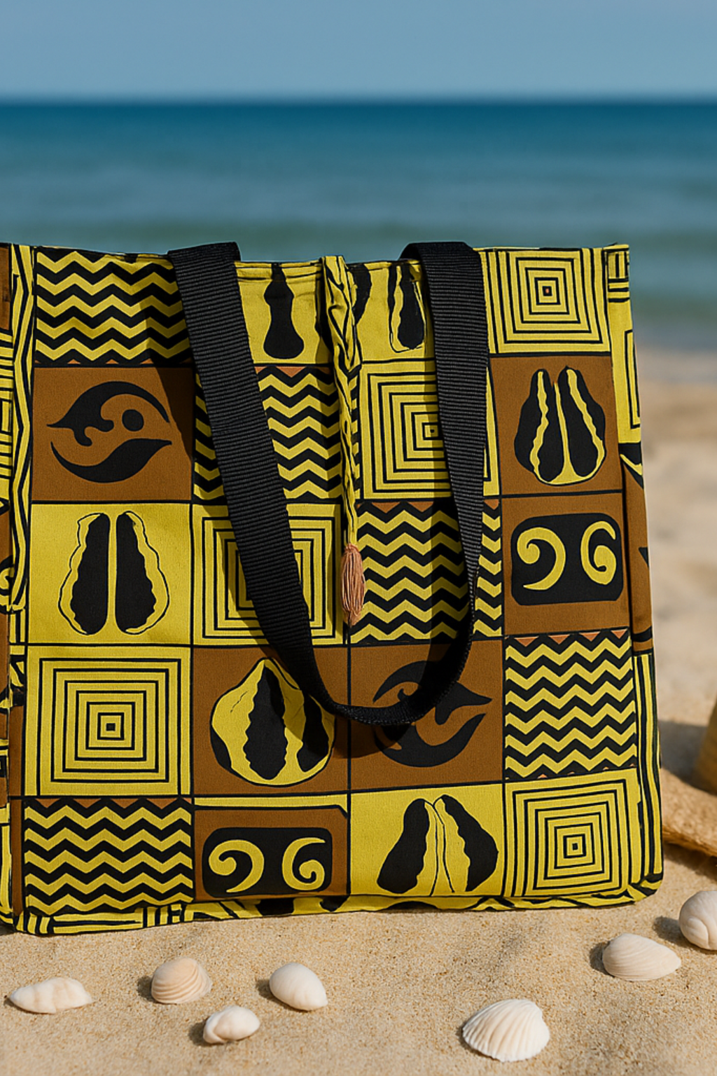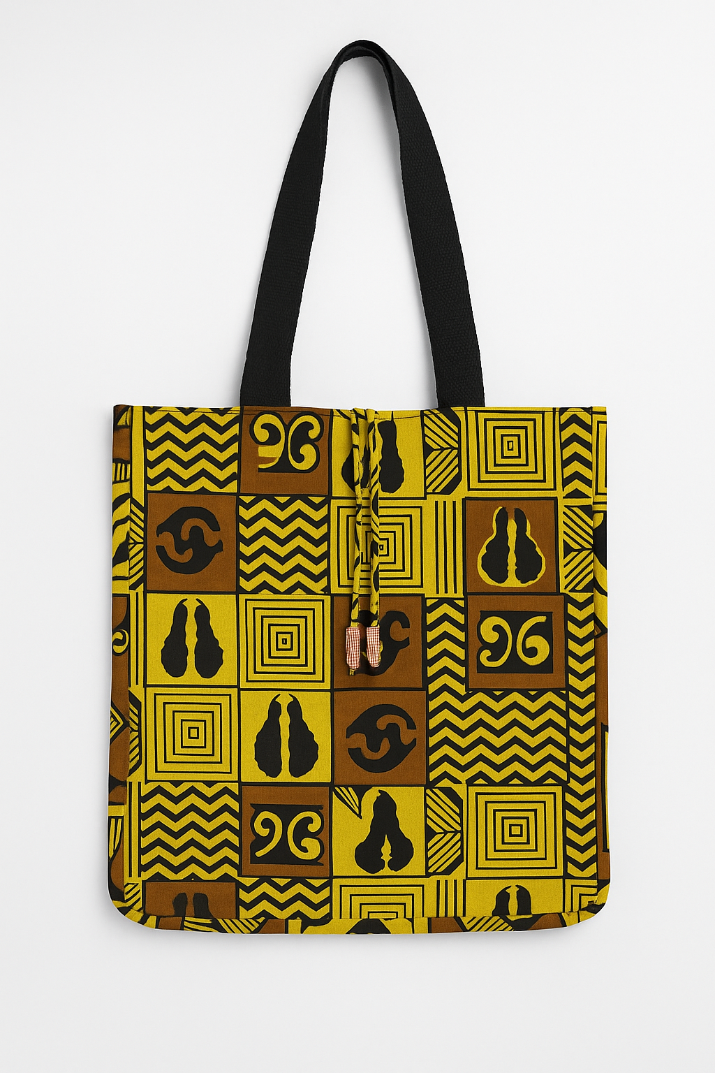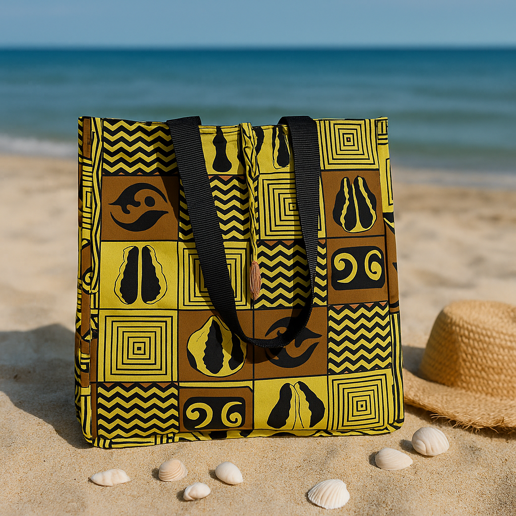 Sac cabas aux tons jaunes et bruns, décoré de symboles traditionnels. Symbole de sérénité, il allie authenticité et modernité.