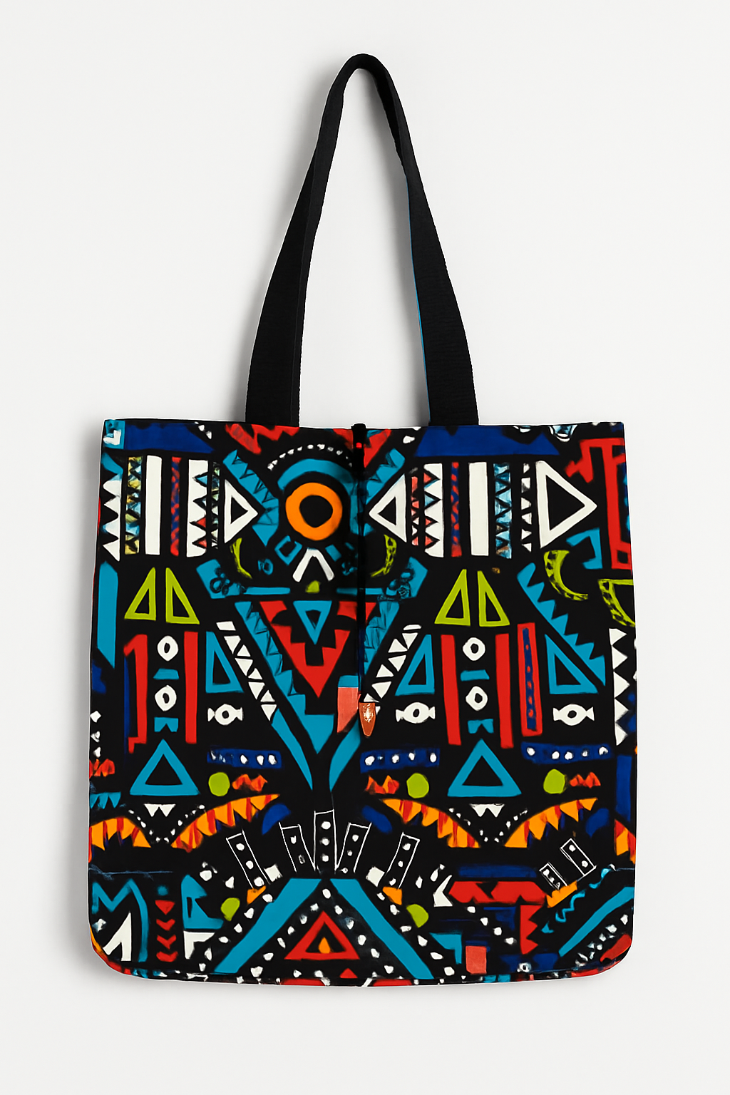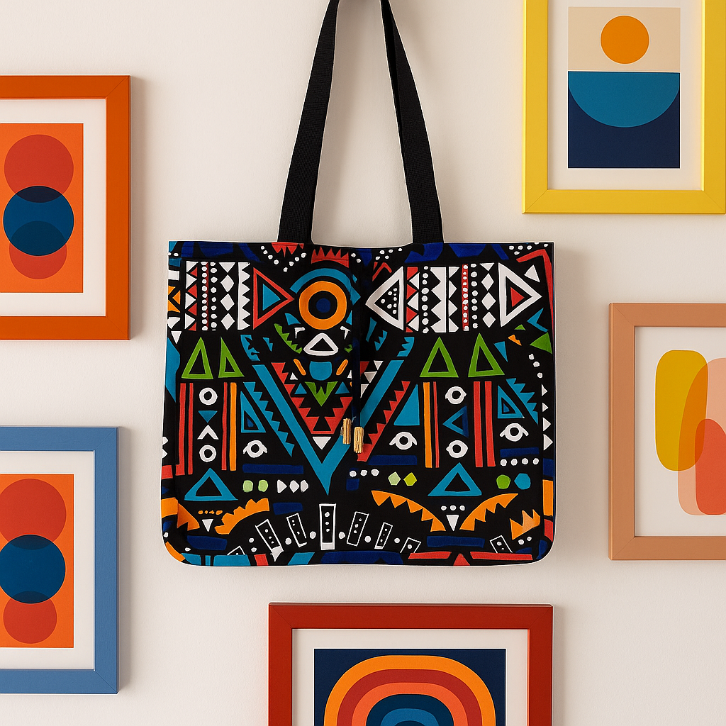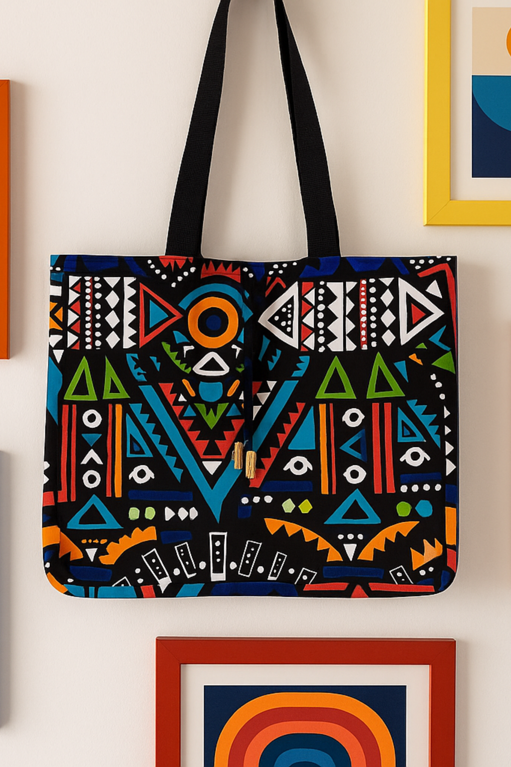 Sac cabas multicolore aux motifs géométriques dynamiques. Pièce vibrante, il incarne la joie et la créativité.