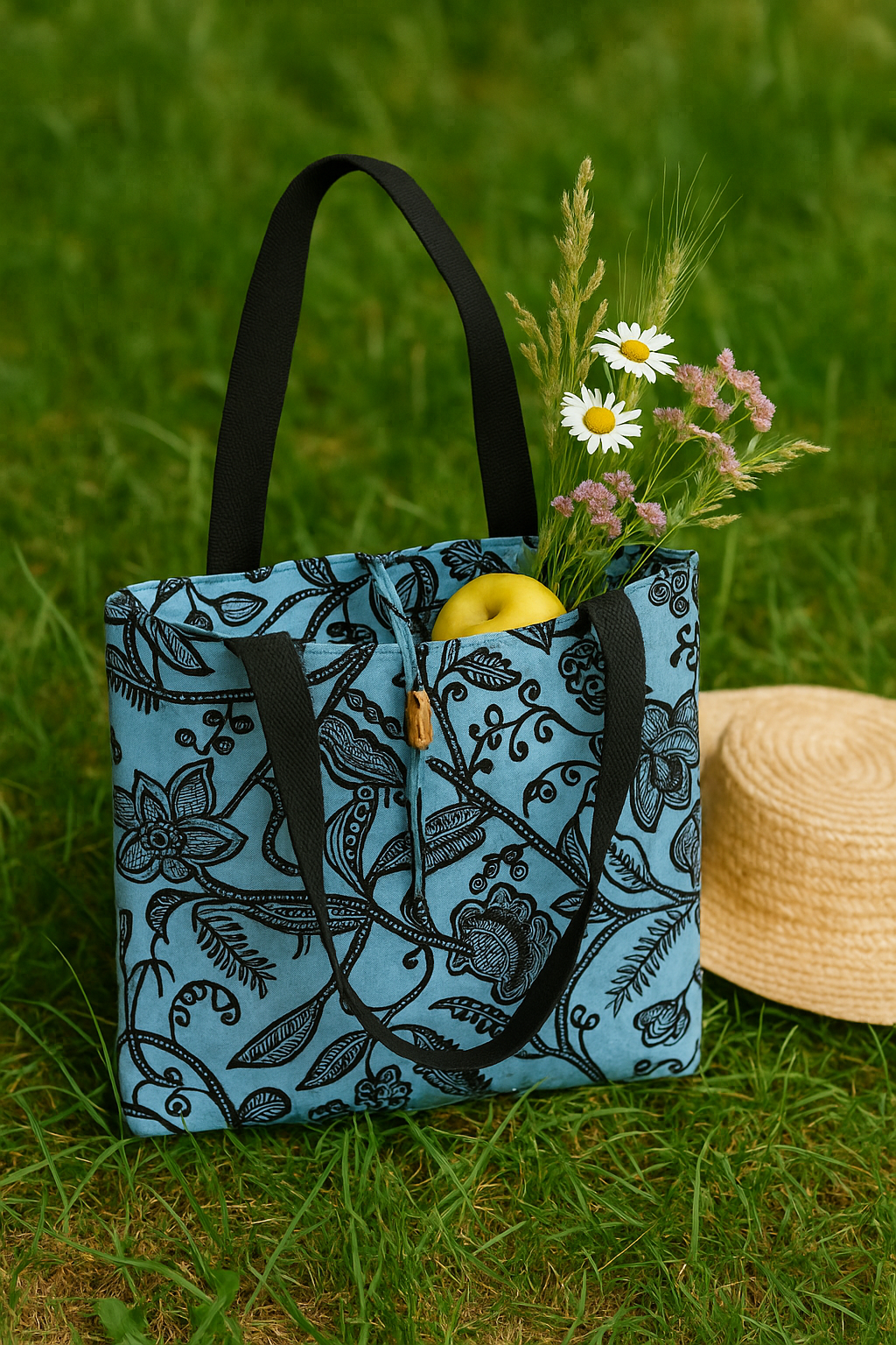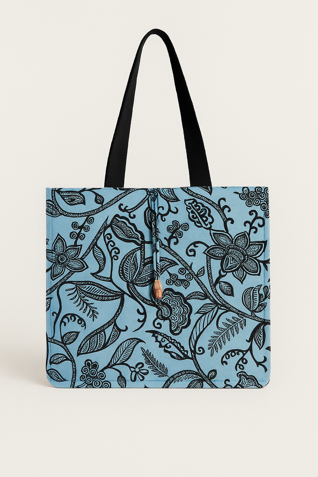 Sac cabas bleu nuit orné de motifs géométriques blancs inspirés du mud cloth. Élégant et intemporel, il reflète la sagesse et la connaissance.