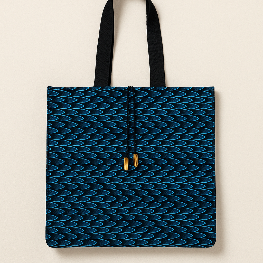Sac cabas bleu marine aux motifs en écailles, inspiré de l’océan. Symbole de sérénité et de voyage.