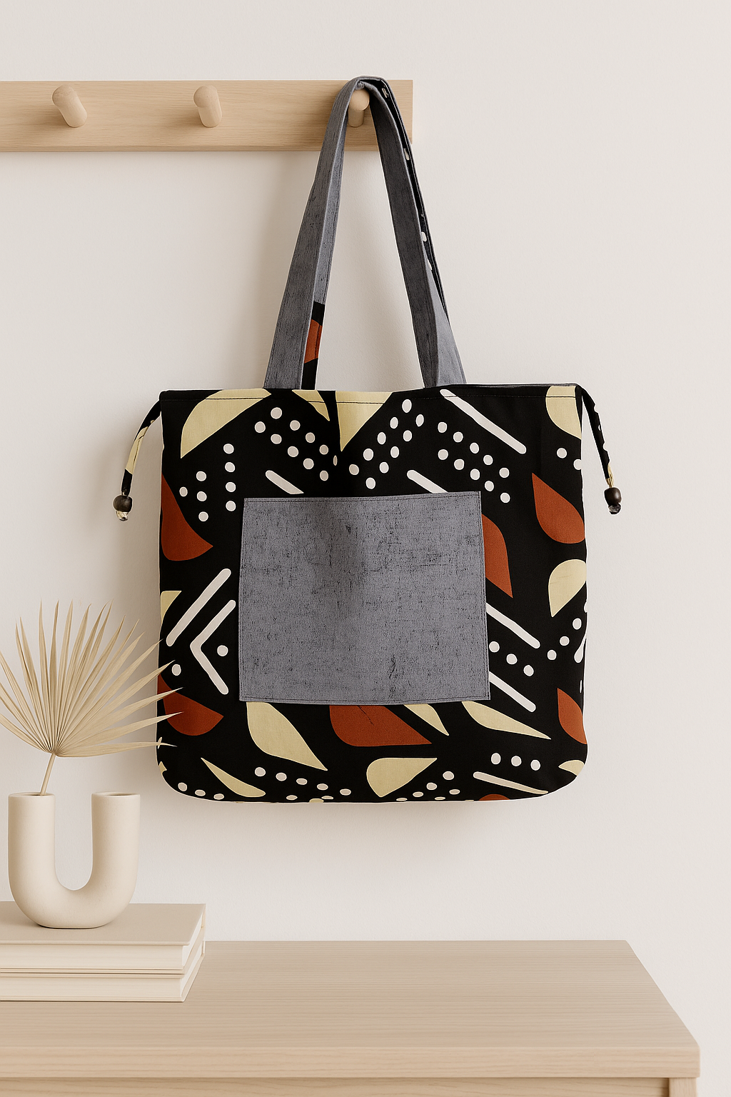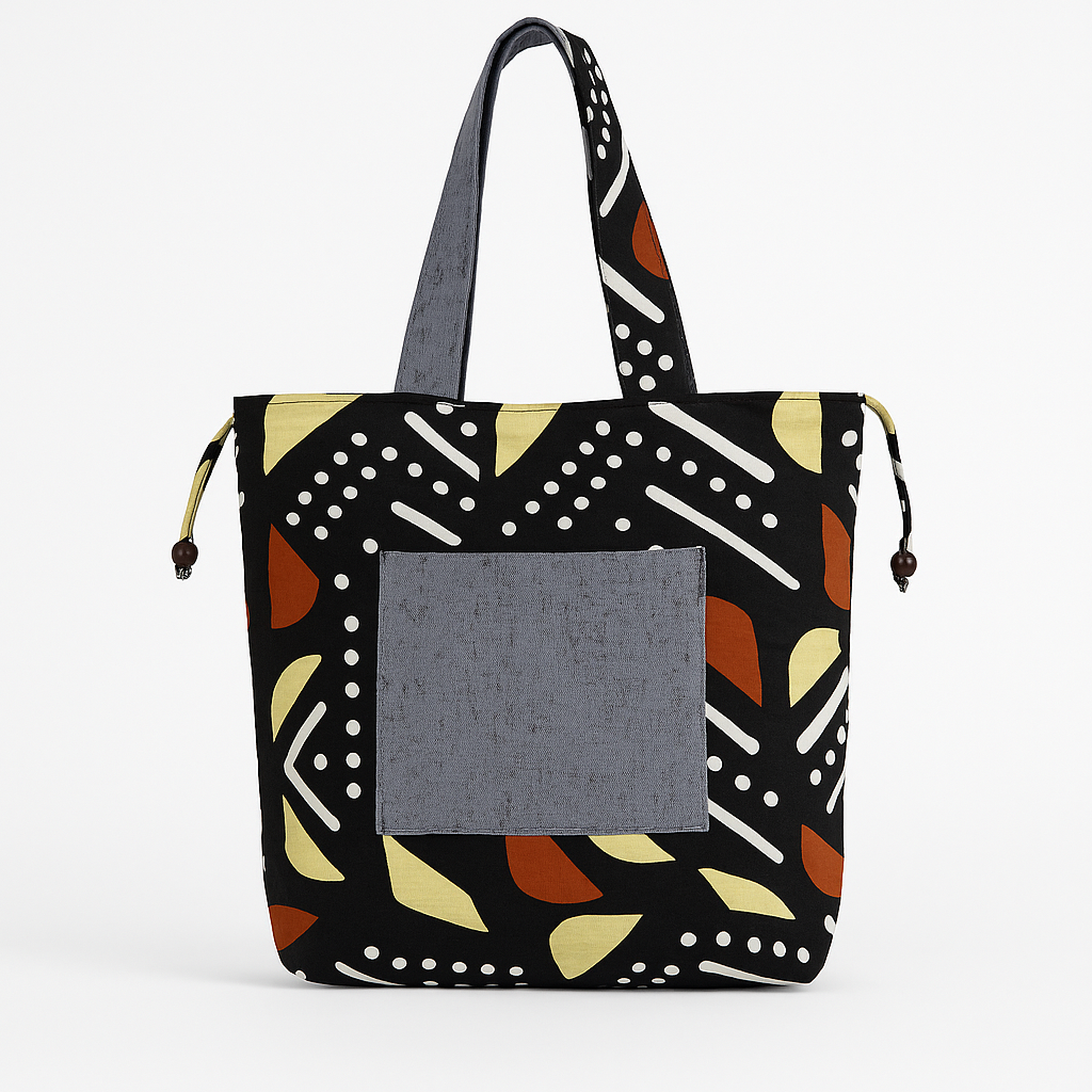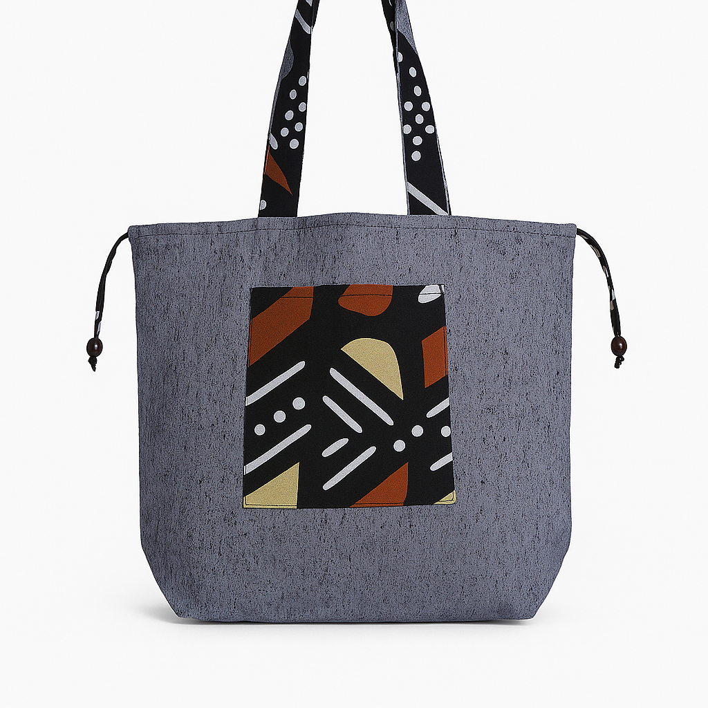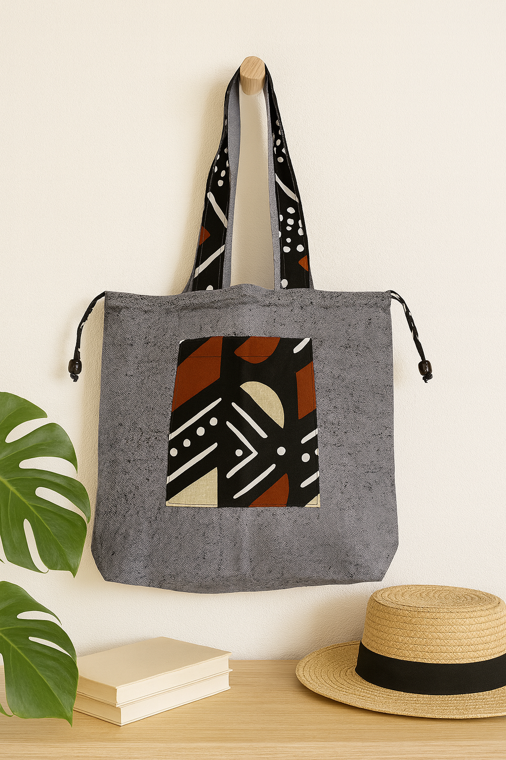 Sac réversible petit modèle, associant un tissu gris sobre et une poche inspirée du bogolan traditionnel brun et blanc. Fabriqué avec soin, il reflète l’authenticité africaine tout en restant moderne et polyvalent.
