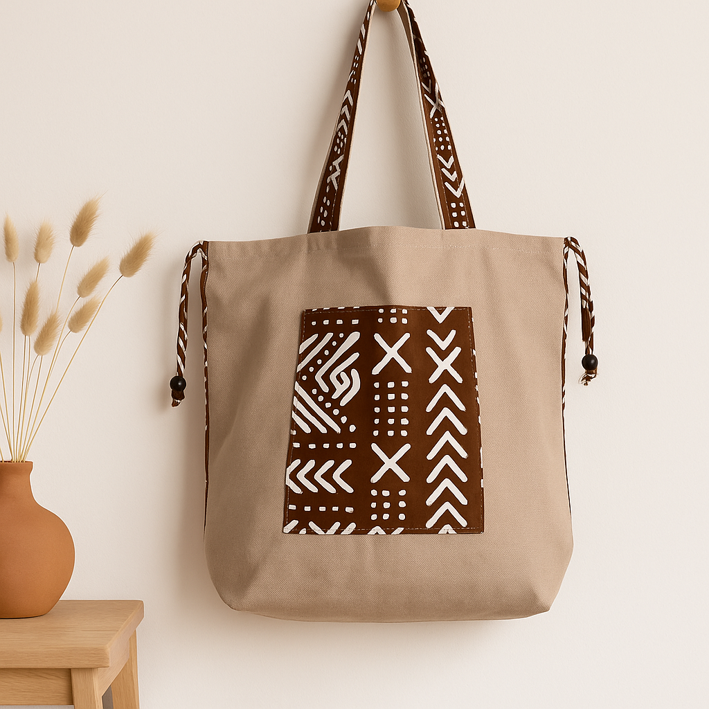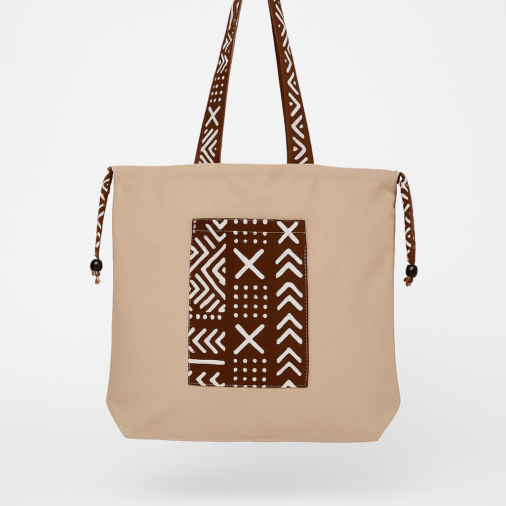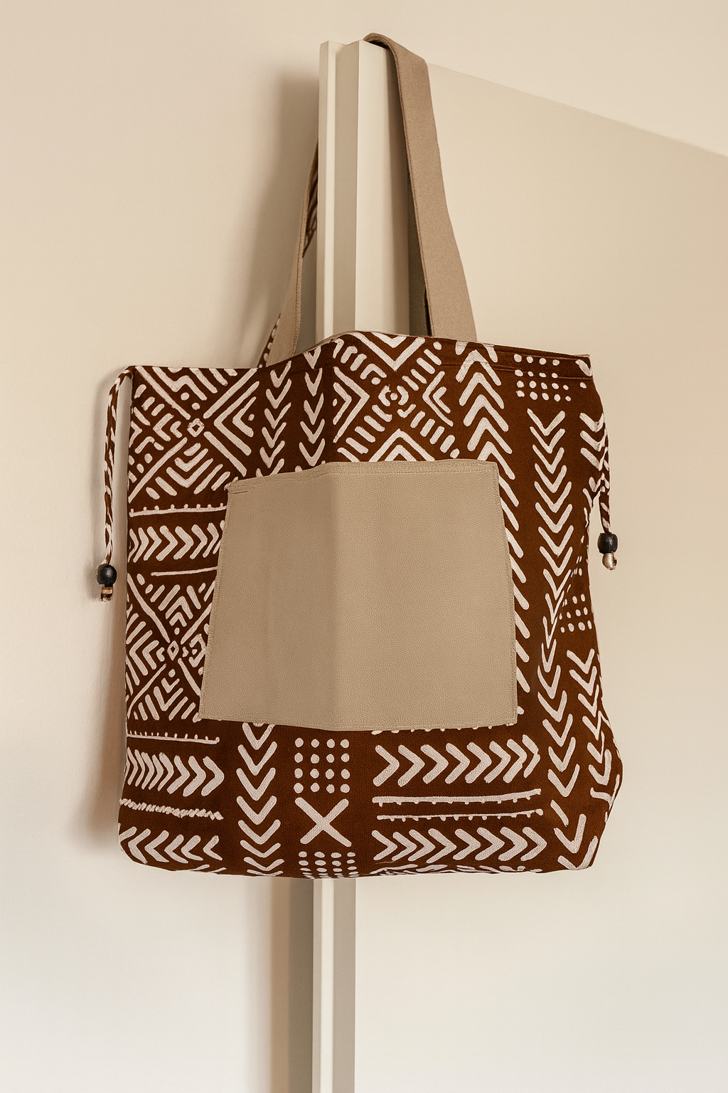 Sac réversible petit modèle en Bogolan brun décoré de motifs géométriques blancs, rehaussé d’une poche beige contrastante. Ce modèle rend hommage au savoir-faire artisanal et s’adapte aussi bien à un look casual qu’à une tenue habillée.