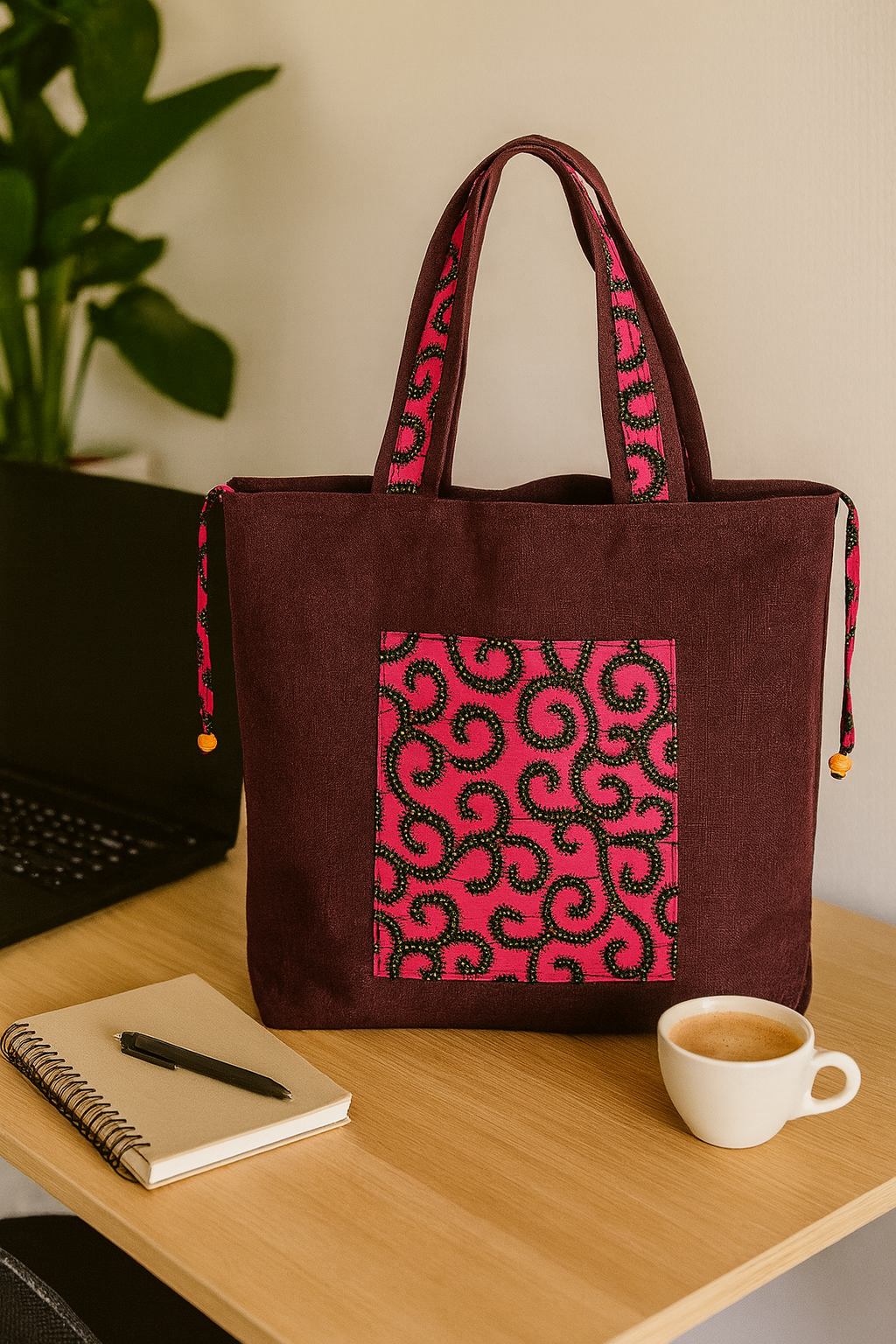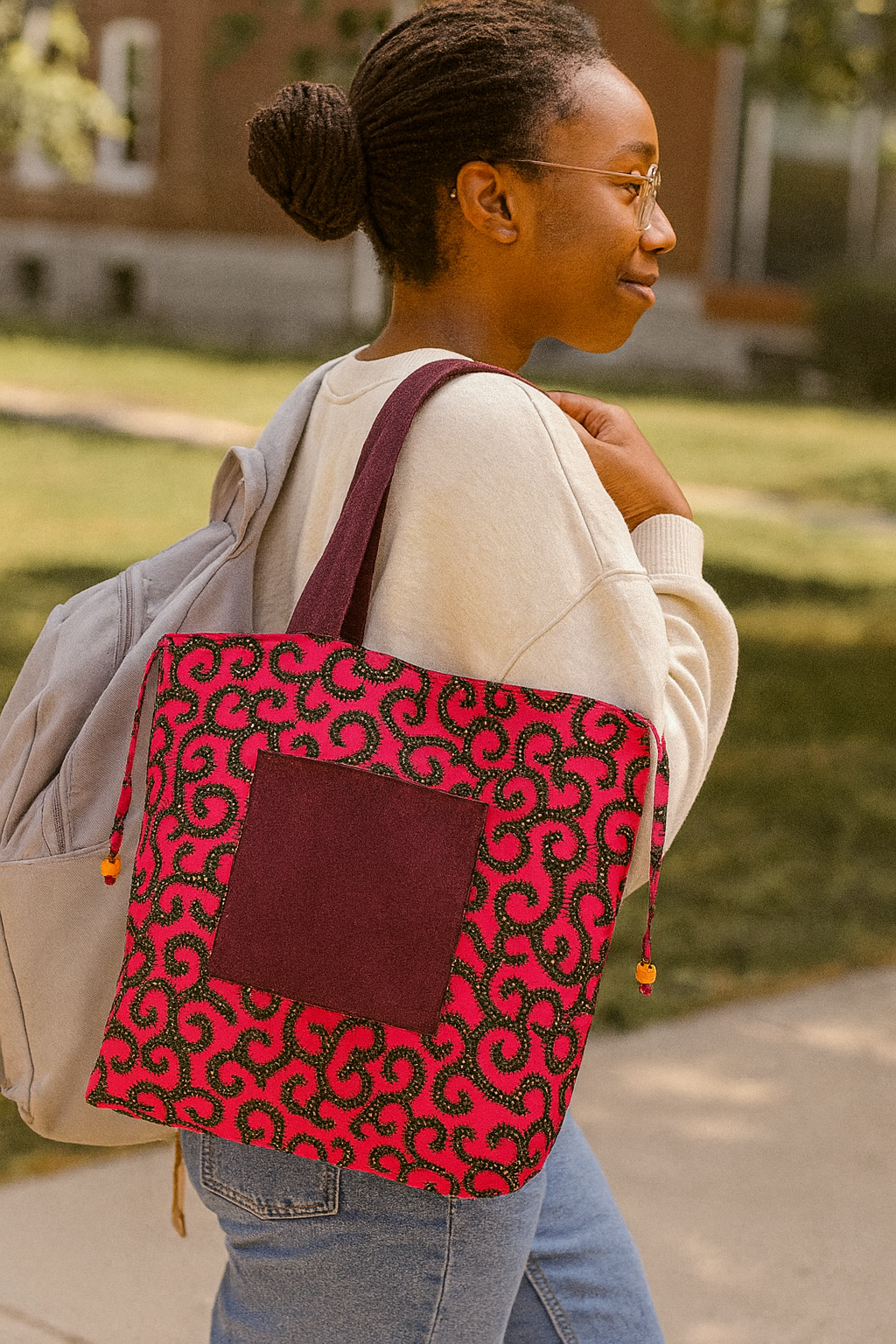 Avec ses spirales colorées sur fond rose et sa base bordeaux élégante, le sac réversible Rose Baobab allie douceur et caractère. Idéal pour les étudiantes, actives ou voyageuses, il séduit par son style unique et sa capacité à contenir l’essentiel du quotidien. Une pièce tendance et pratique qui reflète la force et la beauté de l’Afrique.