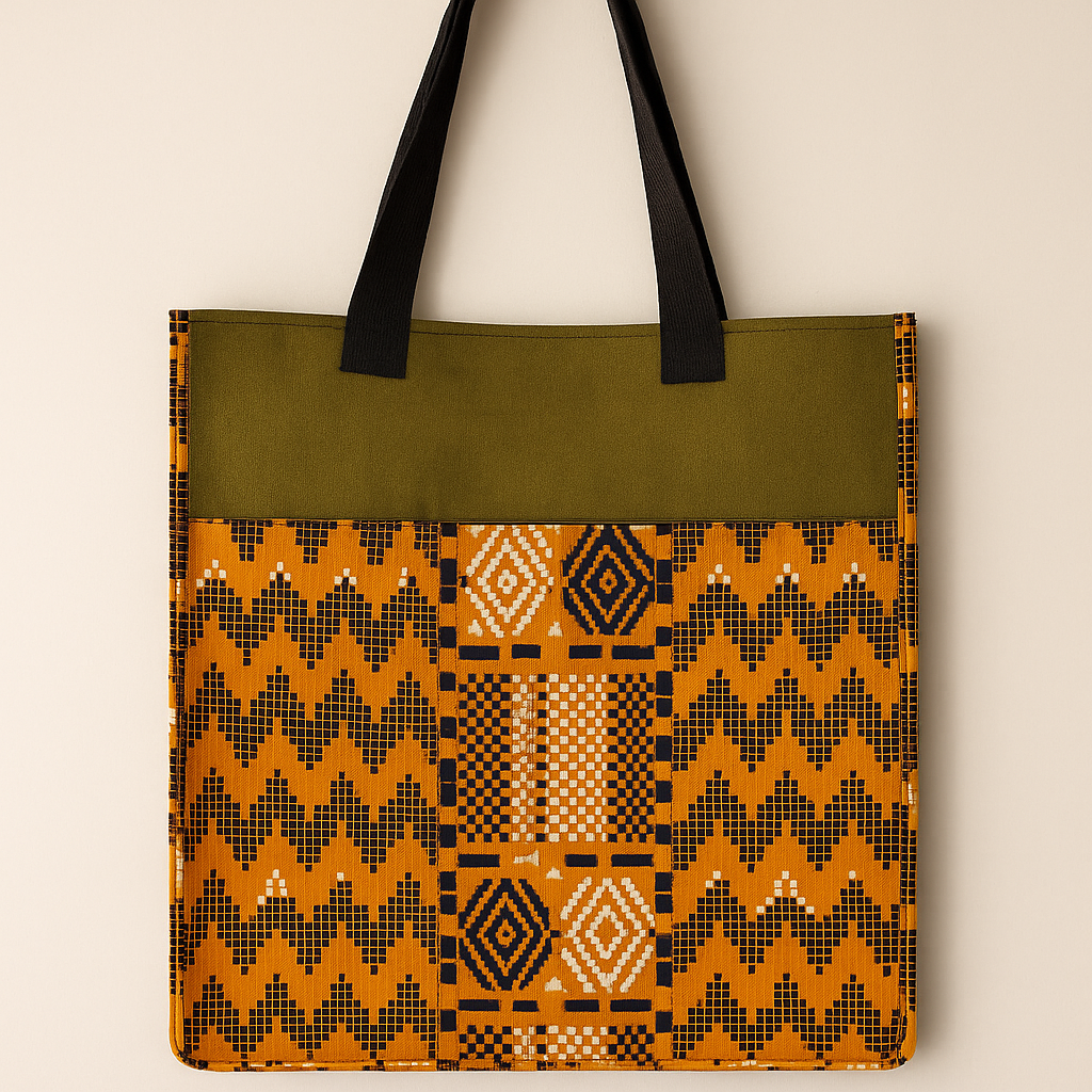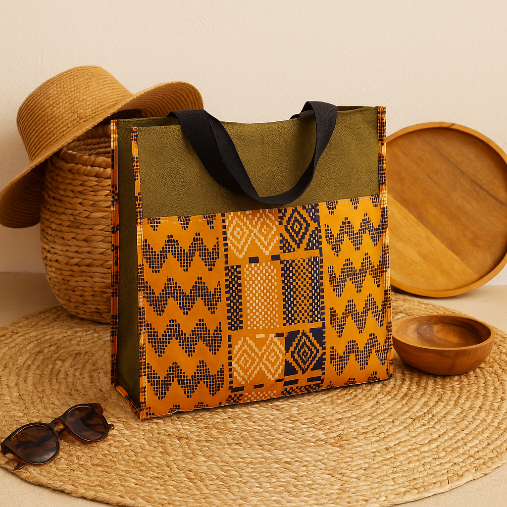 Cabas aux tons chauds orange et olive, esprit naturel.Avec poche intérieure pour plus de rangement.