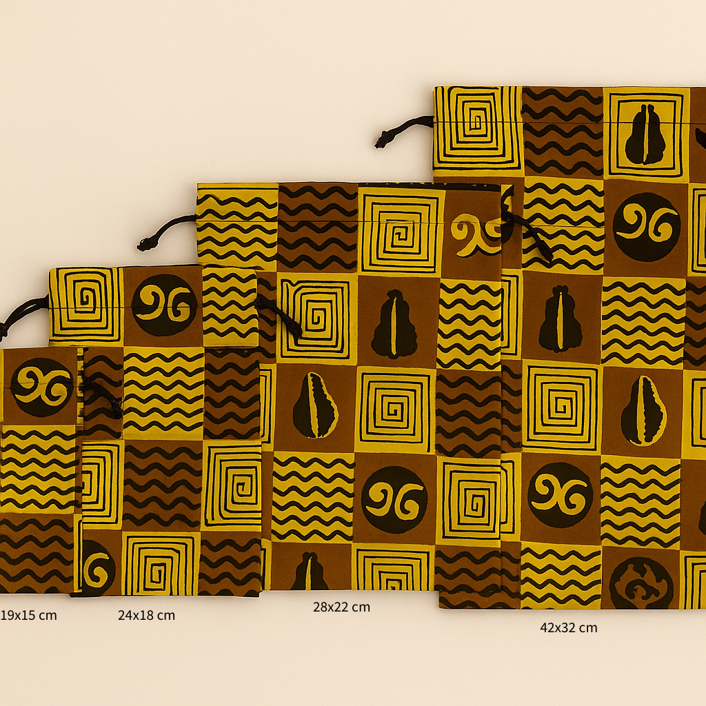Pratiques, élégants et éco-responsables, nos pochons Malik sont confectionnés en wax aux motifs uniques.