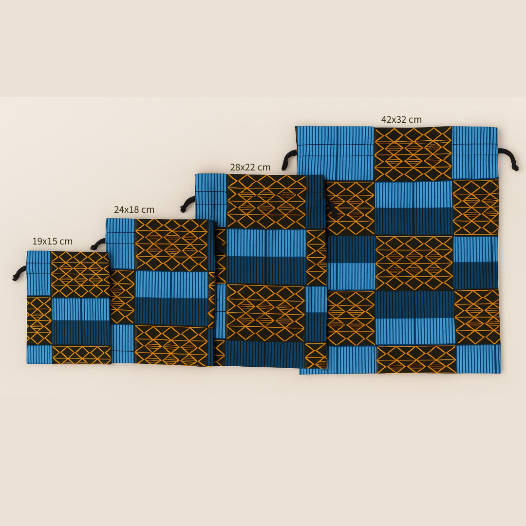 Pratiques, élégants et éco-responsables, nos pochons Malik sont confectionnés en wax aux motifs uniques.