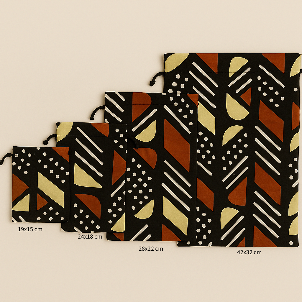 Pratiques, élégants et éco-responsables, nos pochons Malik sont confectionnés en wax aux motifs uniques.